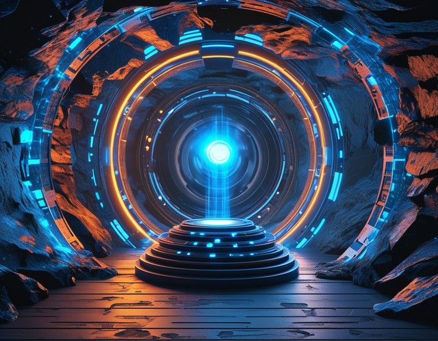 光全息图。魔法游戏门户。圆圈技术效果。数字未来平视显示器。科幻太空传送。发光的蓝色讲台。传送隧道。矢