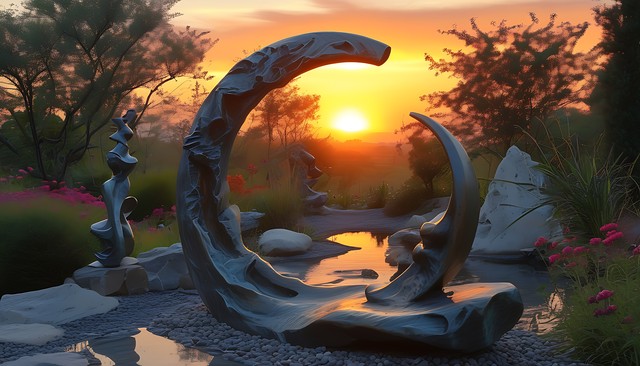 浪漫花园中的日落景象,融合雕塑与自然元素的美感。