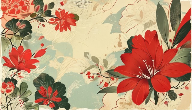 带有艺术自然旗帜的花卉图案。日本设计中带有红花元素矢量的抽象艺术背景。复古风格的手绘植物装饰模板邀请