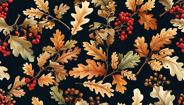 自然元素融合艺术美感,橡树叶片与浆果的无缝图案设计。