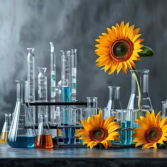 专业实验室填充玻璃器皿,灰色背景上有样品和向日葵