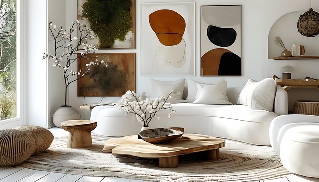 舒适的白色客厅设计,融入自然元素与抽象艺术风格