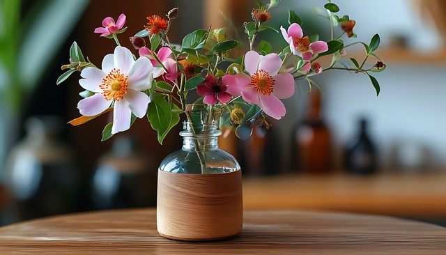 微距拍摄室内瓶花,家具与自然的和谐融合。