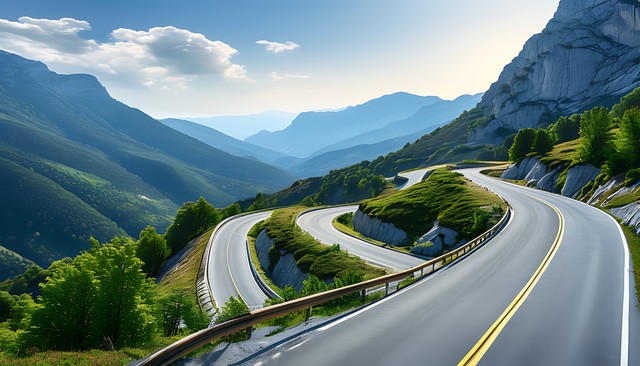 自然山区美景,公路蜿蜒伸展,适合汽车广告背景。