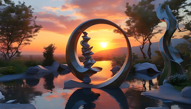 浪漫花园中的日落景象,融合雕塑与自然元素的美感。