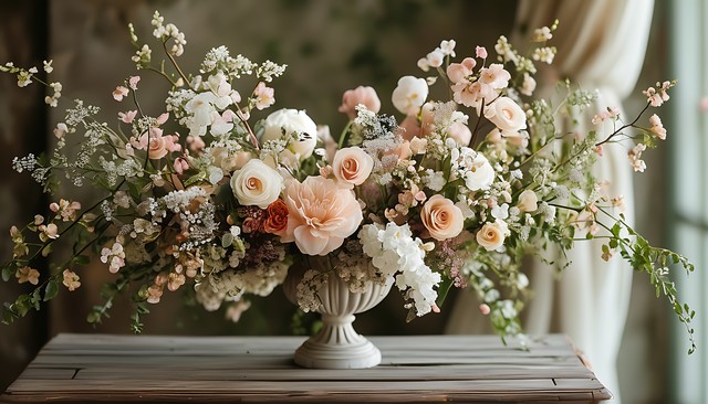 浪漫婚礼鲜花布置,精美花艺与自然元素融合的场景