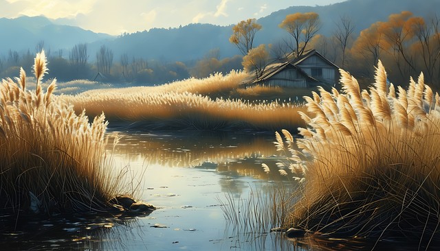 光影交织的芦苇花海,诗意自然的乡村景观。