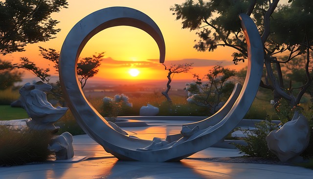 浪漫花园中的日落景象,融合雕塑与自然元素的美感。