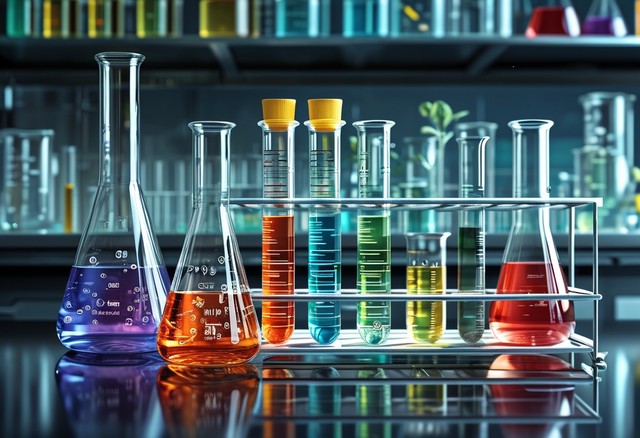 实验室内各种显色试剂反应的试管和烧杯,科学研究的氛围。