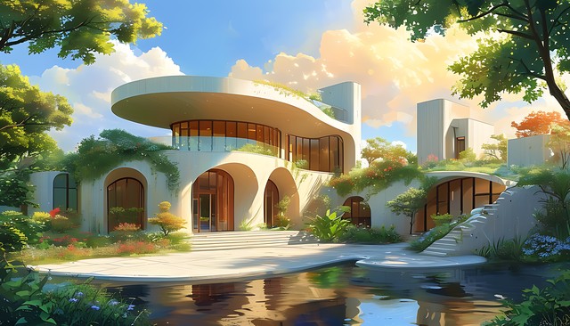 清新艺术建筑插画,阳光与自然元素的完美融合。