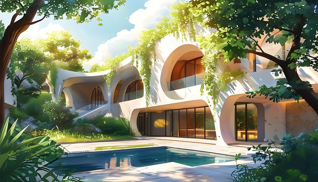 清新艺术建筑插画,阳光与自然元素的完美融合。