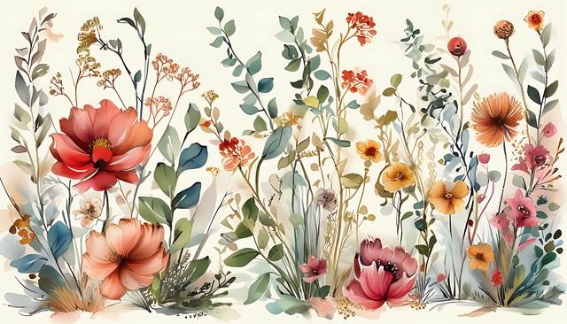 浪漫水彩花卉,手绘艺术风格,自然元素与装饰的融合。