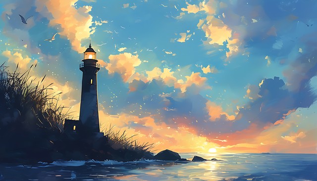 绘制梦幻般的天空背景,融入自然元素与灯塔剪影。