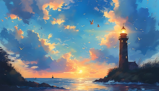 绘制梦幻般的天空背景,融入自然元素与灯塔剪影。