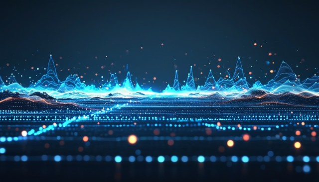 抽象数字景观,深蓝色背景上有发光的线条和点,象征着数据概念。