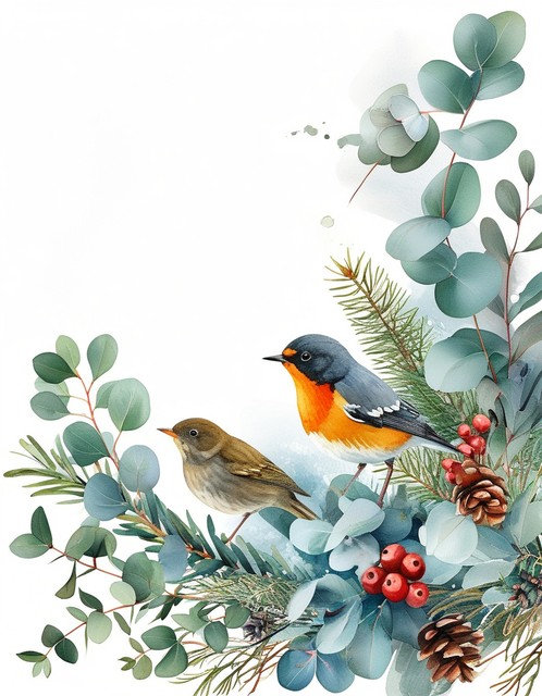 冬季花卉装饰与明亮的鸟,桉树,针叶树。水彩插图。手绘自然风格装饰与莺,松,桉树。冬季舒适的自然装饰。
