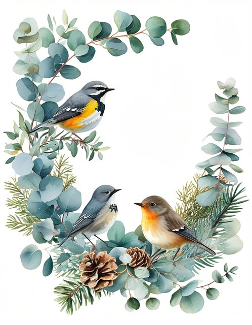 冬季花卉装饰与明亮的鸟,桉树,针叶树。水彩插图。手绘自然风格装饰与莺,松,桉树。冬季舒适的自然装饰。