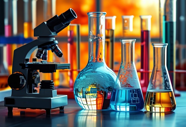 科学概念。研究。科学搜索。教育。应用化学。物理。显微镜和玻璃烧瓶