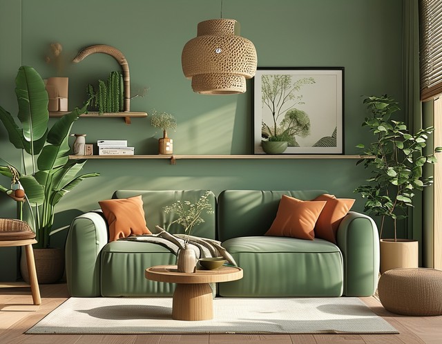 卡通盲盒风格的森系室内客厅,自然元素与温馨家居交织,营造出宁静的绿色栖息地。