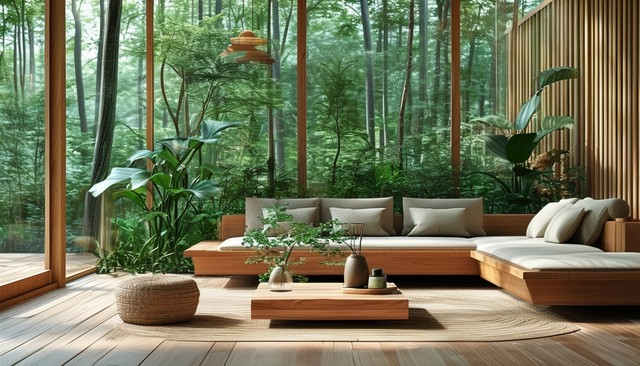 林间的宁静,木质元素与绿植交织的森系客厅,自然光源温暖而柔和。
