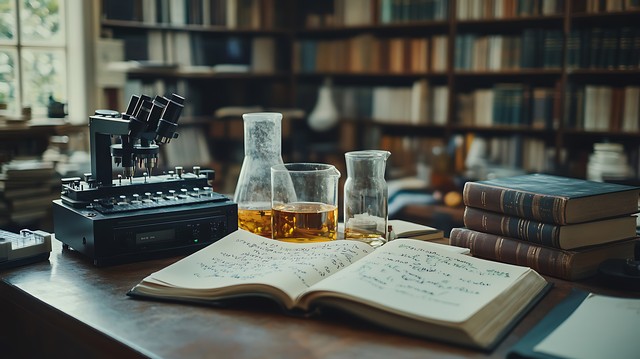 示波器旁边的学术书籍和笔记本,展现出研究者的探索过程。