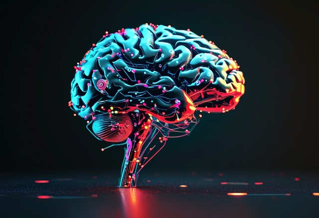 大脑标志图标。科学创新、机器学习或人工智能的数字符号模板。心理学心理健康或新技术发展。深色背景上的矢
