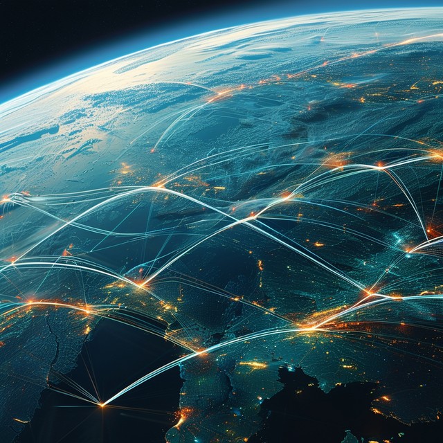 从太空看地球的数字景观,相互连接的节点线路组成网络,传递着地区之间的创新、速度、技术和数据传输
