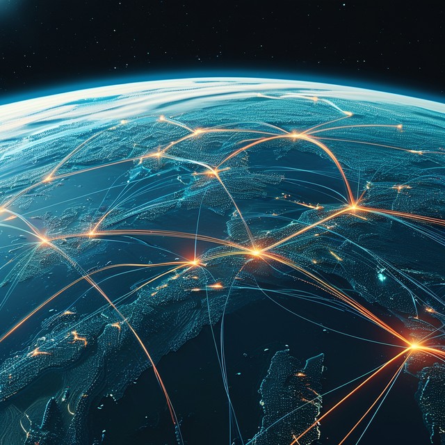 从太空看地球的数字景观,相互连接的节点线路组成网络,传递着地区之间的创新、速度、技术和数据传输