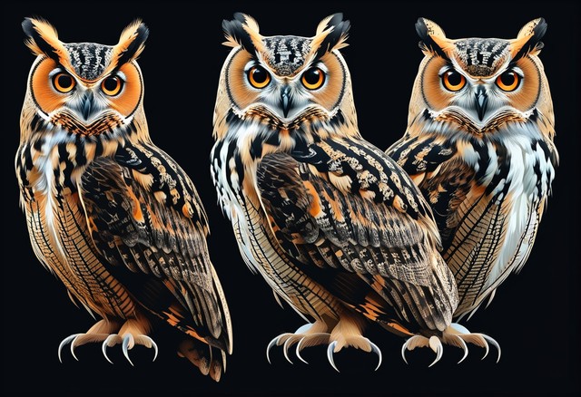 猫头鹰。逼真的野生飞鸟智慧猫头鹰不同品种体面矢量自然符号