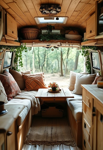一个舒适的露营车内部里面摆满了自然元素