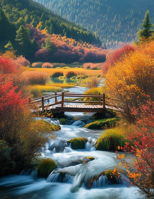 四川甘孜荷花海国家森林公园秋日彩林溪流木桥自然风光