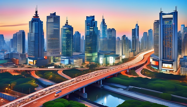 城市天际线的黄昏美景,建筑、交通与自然元素的和谐交融。