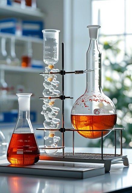 蒸馏架和实验室烧瓶,白色背景上有液体,特写