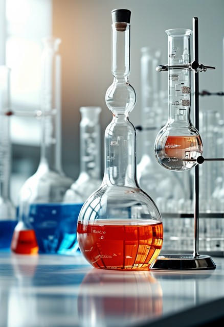 蒸馏架和实验室烧瓶,白色背景上有液体,特写