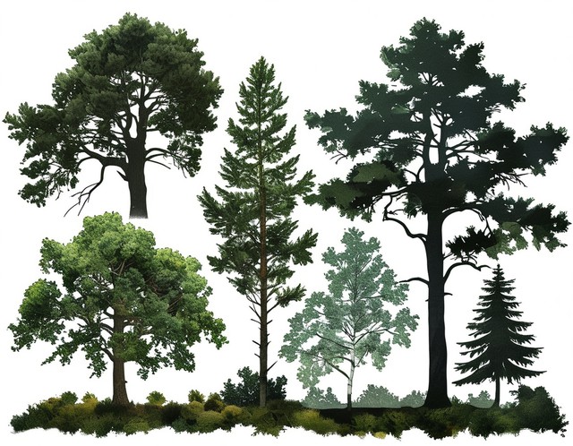 一组树剪影。一组带有森林和公园植物、松树、云杉、橡树和杨树的图标。自然和环境。有机设计元素。孤立在白