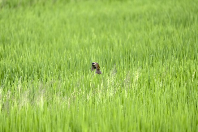 绿色水稻田青草地,白头翁野生鸟类,自然风景田园风光。