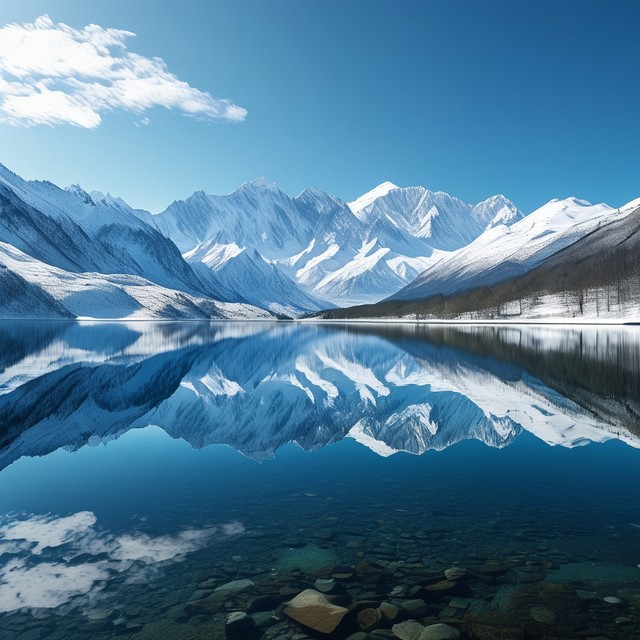 清澈湖泊倒映着壮丽的雪山与蓝天,宁静自然。