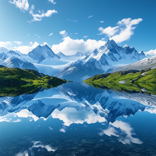 清澈湖泊倒映着壮丽的雪山与蓝天,宁静自然。