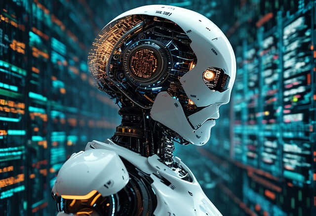 高级人工智能机器人连接到具有二进制代码背景的数字云系统。数字大脑神经网络、人工智能服务器和机器人技术
