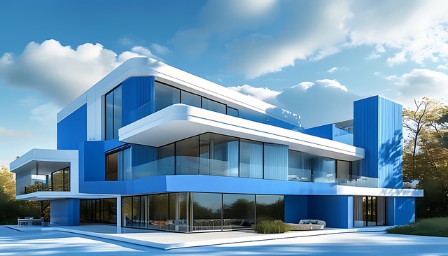 现代建筑设计风格下的蓝色与白色建筑外观,融入天空与自然元素