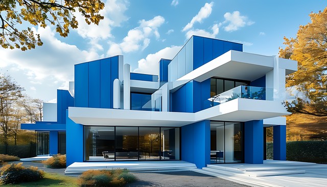现代建筑设计风格下的蓝色与白色建筑外观,融入天空与自然元素