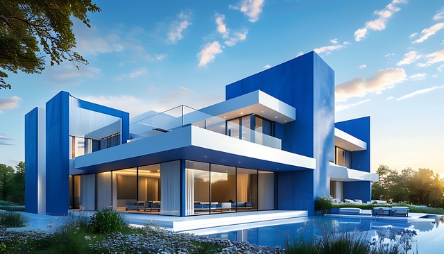 现代建筑设计风格下的蓝色与白色建筑外观,融入天空与自然元素