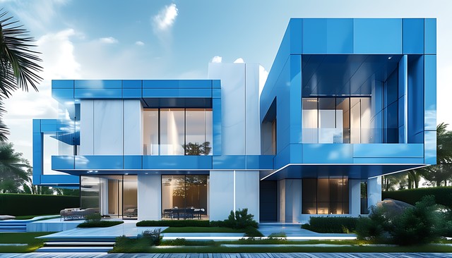 现代建筑设计风格下的蓝色与白色建筑外观,融入天空与自然元素