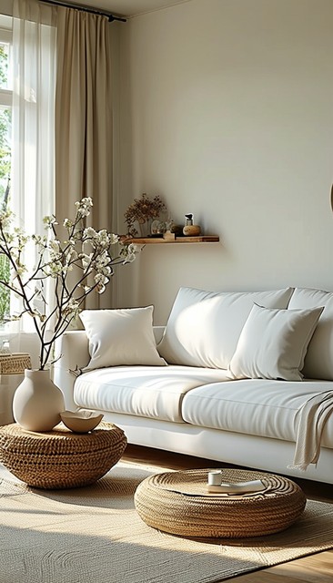 温馨的客厅,白色沙发与自然元素搭配,展示宁静和舒适的氛围。