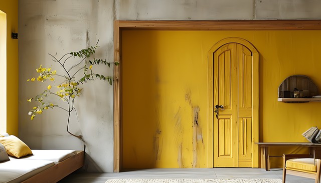 展现木质门与黄色墙壁的创意融合,融入自然元素与家居设计。