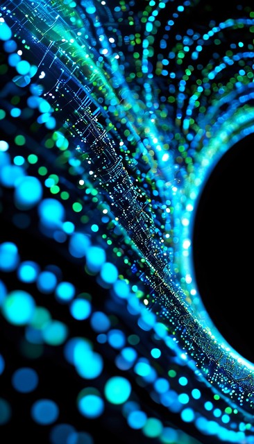 抽象圆点线条图案旋转蓝色绿光孤立在黑色背景中的音乐、技术、数字概念