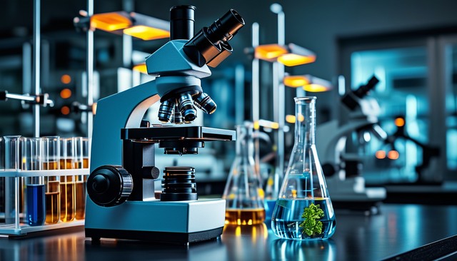 生物技术实验室中的显微镜,专业设备。科学研究理念