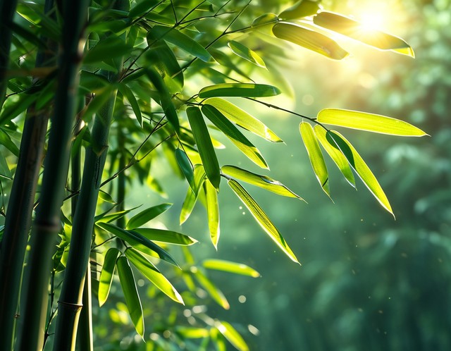 阳光透过竹林照射下的竹叶,清新自然的绿色美景。