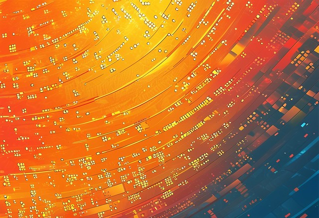 点点半色调橙黄色彩色图案渐变纹理,带有技术数字背景。夏季背景的点点流行艺术漫画。