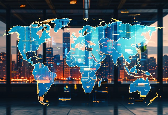芝加哥办公楼背景、大数据和数字技术概念上的图形美国地图全息图双重曝光